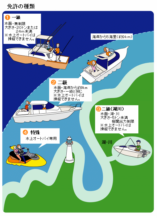 ・航行区域:乗船する船舶ごとに規定された区域(安全に発着できる任意の地点から15海里(約27.8km)以内の水域のうち、当該地点における海岸から2海里(約3.7km)以内の水域及び平水区域内の陸岸から2海里以内の水域に限る。)